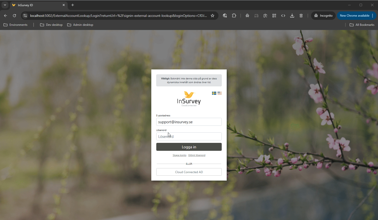 Om din organisation använder ett eget inloggningsflöde, till exempel via en SSO-lösning (Single Sign-On), påverkas du inte av denna förändring. Ditt nuvarande sätt att logga in kommer att fungera precis som tidigare, utan några extra steg i InSurvey.