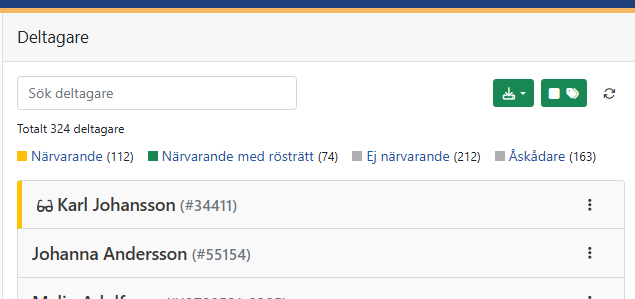 Varje filter visar en dynamiskt uppdaterad räknare, vilket gör det enkelt att se hur många som är närvarande och röstberättigade – när som helst under mötets gång.